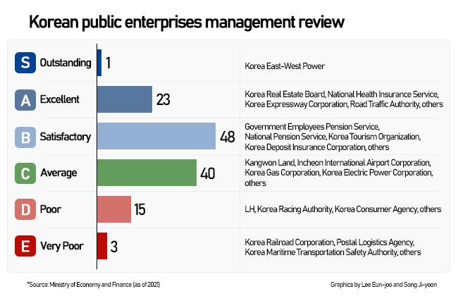 Korea South-East Power, Korea Expressway Corporation, and 21 other institutions received outstanding A grade and 48 including Yeosu Gwangyang Port Authority and Korea Hydro & Nuclear Power B grade. Forty others were graded with C, including Kangwon Land and Incheon International Airport Corporation.