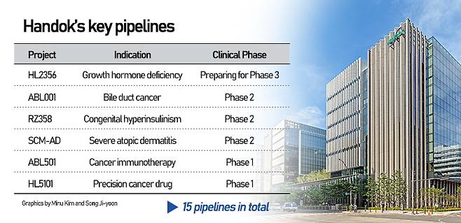 Handok has developed 15 pipelines in total, including HL2356 for the treatment of hormone deficiency in children and adults, and drugs for the treatment of congenital hyperinsulinism and severe atopic dermatitis. It also holds marketing rights for bile duct cancer drug ABL001 jointly developed with ABL Bio in Korea.