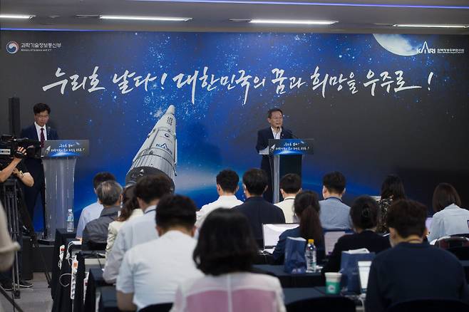 이종호 과학기술정보통신부 장관이 21일 전라남도 고흥군 나로우주센터 프레스룸에서 '누리호 발사 결과' 관련 브리핑을 하고 있다.
