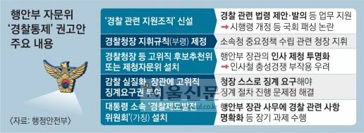아울러 행안부 장관이 경찰청을 지휘하는 규칙을 제정해 행안부에 경찰 고위직 인사를 위한 후보추천위원회 혹은 제청자문위원회를 설치하도록 했다. 경찰 감찰과 징계제도를 개선한다는 내용도 담았다. 자치경찰을 제대로 키워 경찰권을 지방으로 분산하고 국가경찰을 통제하자는 방안은 자문위가 대통령 직속으로 설치를 권고한 가칭 경찰제도발전위원회에서 장기 과제로 논의된다.