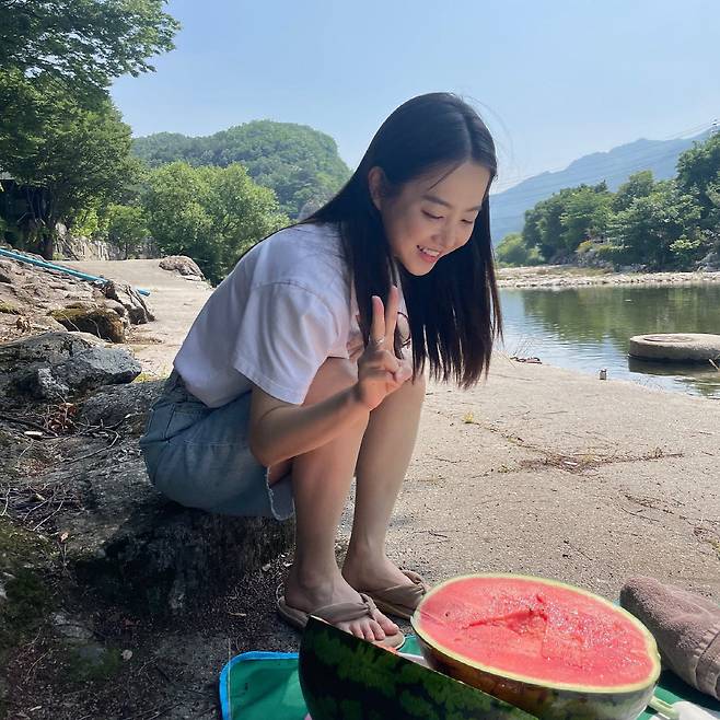 사진 속 박보영은 한 강가에 앉아 잘 익은 수박 반통을 앞에 두고 손가락으로 'V'자를 만드는 포즈를 취하고 있다.