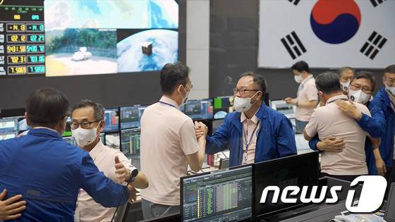 (서울=뉴스1) 신웅수 기자 = 순수 국내기술로 제작된 한국형 최초 우주발사체 '누리호'(KSLV-Ⅱ)'가 성공적으로 발사된 21일 고흥 나로우주센터 임무통제센터에서 연구원들이 환호하고 있다.