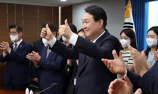 | 尹대통령 ‘엄지 척’ 윤석열 대통령이 21일 용산 대통령실 청사 영상회의실에서 이종호 과학기술정보통신부 장관으로부터 누리호 2차 발사가 성공했다는 결과를 영상으로 보고받은 후 엄지를 치켜들고 있다. 대통령실사진기자단 |