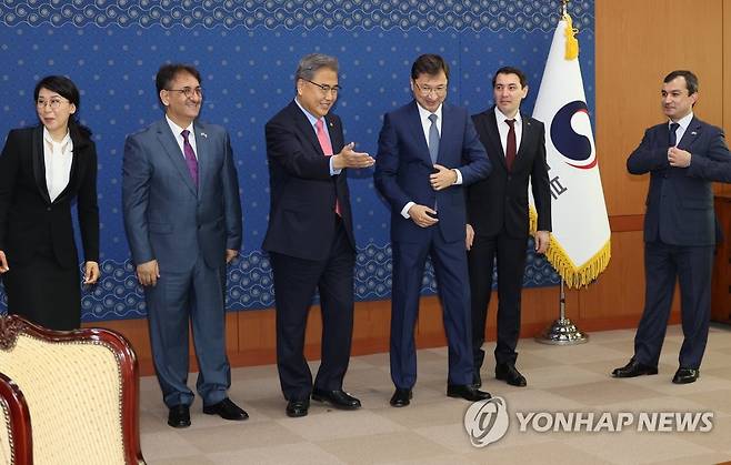 (서울=연합뉴스) 김승두 기자 = 박진 외교부 장관이 22일 서울 도렴동 외교부 청사에서 주한중앙아시아 5개국 대사들과 만나 기념촬영을 한 후 이동하고 있다. 2022.6.22