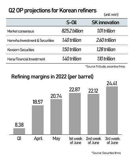 “Given the various geopolitical situations including the relationship between the U.S. and Saudi Arabia, crude oil prices will likely stay high for the time being, which is favorable for Korean refiners,” said Jeon Woo-je, a researcher at Hanwha Investment & Securities. He raised the second-quarter operating income estimates for S-Oil and SK innovation from 1 trillion won to 1.4 trillion won and from 2 trillion won to 2.6 trillion won, respectively.