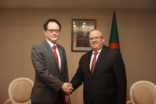 (서울=연합뉴스) 21일(현지시간) 알제리 알제에서 열린 제5차 한-알제리 정책협의회에 참여한 김장현 외교부 아프리카중동국장(왼쪽)과 부메디엔 겐나드 알제리 외교부 아시아대양주총국장이 악수하고 있다. 2022.6.22 [외교부 제공. 재판매 및 DB 금지]