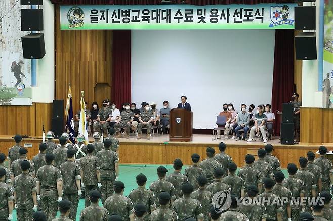 (인제=연합뉴스) 22일 강원 인제군 육군 12보병사단 신병교육대대에서 수료식이 진행되고 있다. 이날 수료식은 신종 코로나바이러스 감염증(코로나19) 이후 2년간 중단됐던 가족 동반 수료식으로 진행됐다. 2022.6.22 [인제군 제공. 재판매 및 DB 금지]
