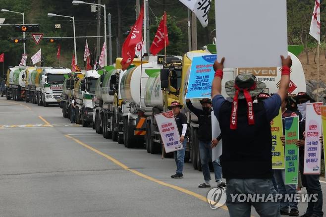 (서울=연합뉴스) 김주성 기자 = 총파업에 참가한 민주노총 화물연대 오일탱크로리지부 소속 에스오일 유조차 기사들이 22일 성남 분당구 대한송유관공사 앞에서 유조차를 줄지어 세워놓고 유가 폭등에 따른 운송료 인상과 근무조건 개선 등을 요구하고 있다. 2022.6.22
