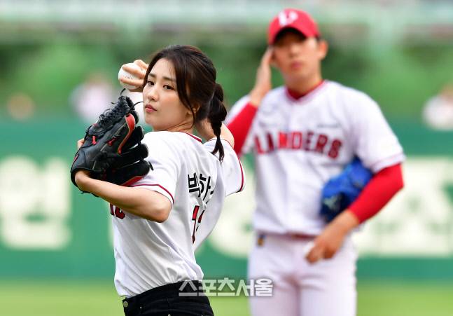 배우 박하선이 22일 인천SSG랜더스필드에서 열린 2022프로야구 SSG랜더스와 두산베어스의 경기에서 시구를 하고 있다. 2022.6.22.