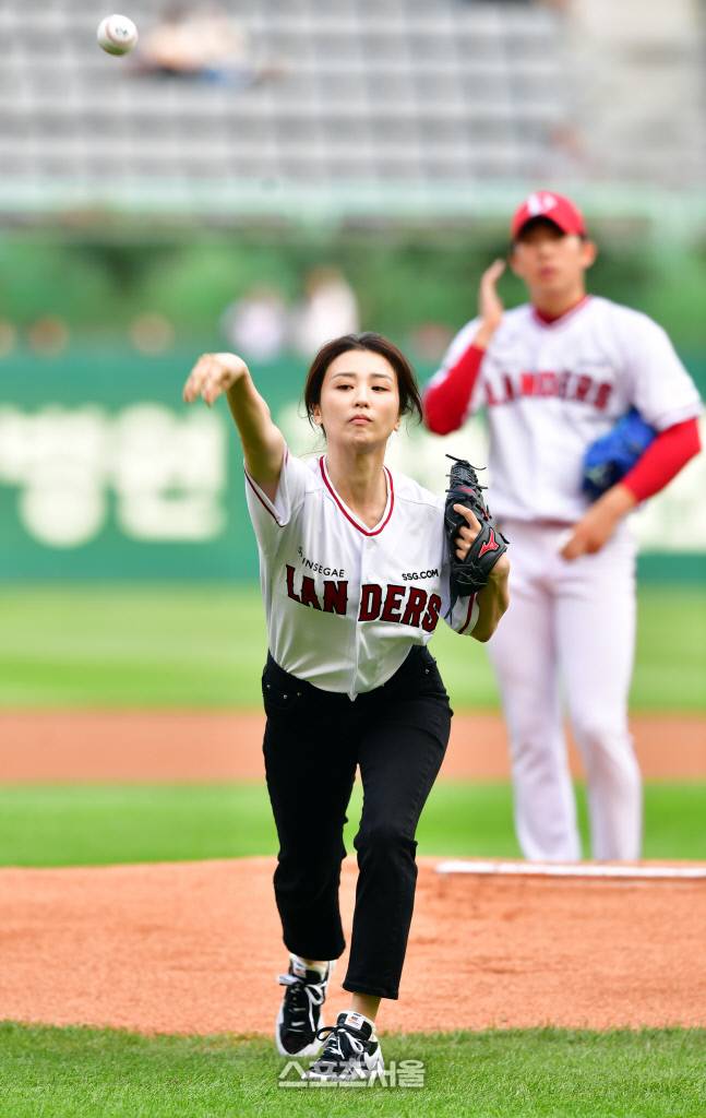 배우 박하선이 22일 인천SSG랜더스필드에서 열린 2022프로야구 SSG랜더스와 두산베어스의 경기에서 시구를 하고 있다. 2022.6.22.