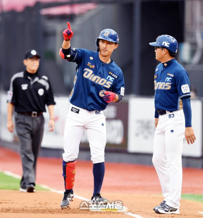 NC 노진혁이 22일 수원 KT위즈파크에서 열린 KBO리그 KT와 경기 1회초 1사 안타를 친 후 세리머니를 하고 있다.
