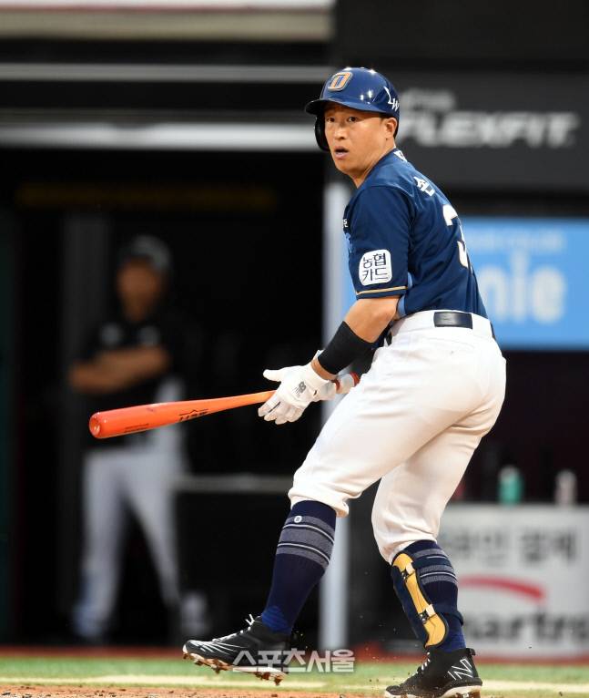 NC 손아섭이 22일 수원 KT위즈파크에서 열린 KBO리그 KT와 경기 3회초 2사 파울타구를 바라보고 있다.