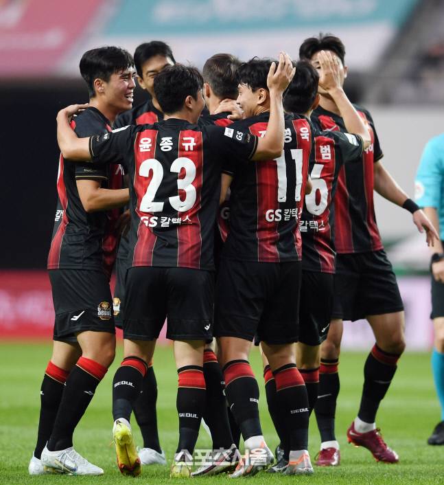 FC서울 선수들이 22일 서울월드컵경기장에서 열린 하나원큐 K리그1 2022 울산 현대와의 경기에서 팔로세비치의 선제골에 기뻐하고 있다. 2022. 6. 22.