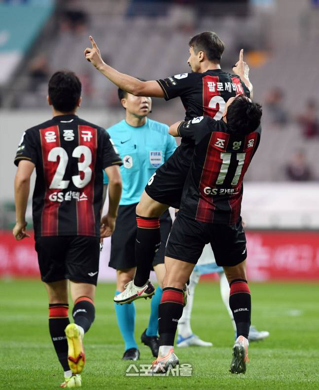 FC서울 팔로세비치(오른쪽 위)가 22일 서울월드컵경기장에서 열린 하나원큐 K리그1 2022 울산 현대와의 경기에서 선제골을 넣은 뒤 동료들과 함께 기뻐하고 있다. 2022. 6. 22.
