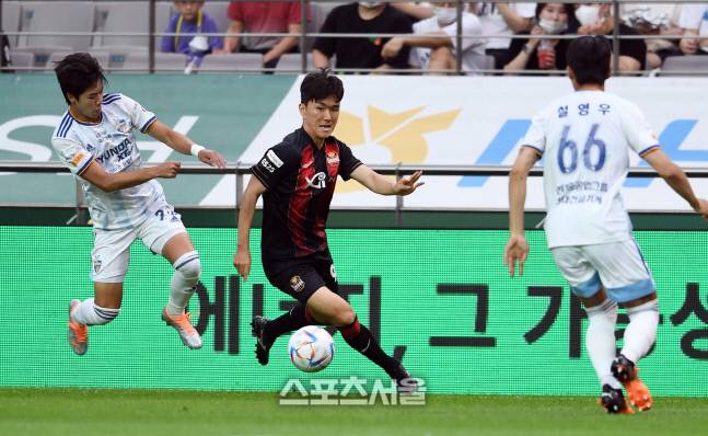 FC서울 황인범(가운데)이 22일 서울월드컵경기장에서 열린 하나원큐 K리그1 2022 울산 현대와의 경기에서 울산 수비진 사이를 돌파하고 있다. 2022. 6. 22.