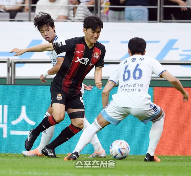 FC서울 황인범(가운데)이 22일 서울월드컵경기장에서 열린 하나원큐 K리그1 2022 울산 현대와의 경기에서 울산 수비진 사이를 돌파하고 있다. 2022. 6. 22.