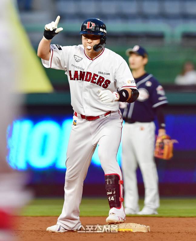 SSG 3번타자 최정이 22일 인천SSG랜더스필드에서 열린 2022프로야구 SSG랜더스와 두산베어스의 경기 5회말 2사 1,2루에서 역전 2타점 2루타로 출루하고 있다.. 2022.6.22.