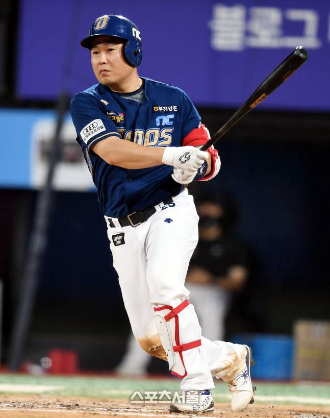 NC 양의지가 22일 수원 KT위즈파크에서 열린 KBO리그 KT와 경기 6회초 1사만루 2타점 2루타를 치고 있다.