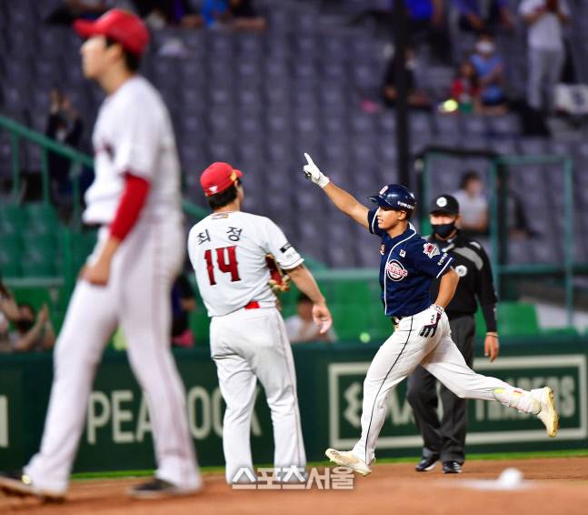 두산 8번타자 양찬열이 22일 인천SSG랜더스필드에서 열린 2022프로야구 SSG랜더스와 두산베어스의 경기 7회초 1사후 호투하던 오원석을 상대로 우월 솔로홈런을 터트린 후 홈인하고 있다. 3루를 향하며 환호하는 양찬열. 2022.6.22.