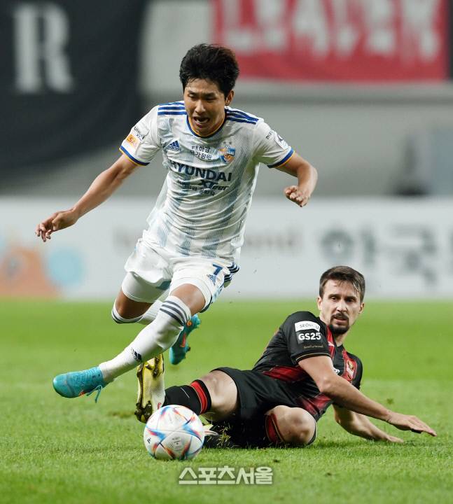 울산 현대 윤일록(왼쪽)이 22일 서울월드컵경기장에서 열린 하나원큐 K리그1 2022 FC서울과의 경기에서 서울 팔로세비치의 백태클에 걸려 넘어지고 있다. 팔로세비치는 백태클로 경고를 받았다. 2022. 6. 22.