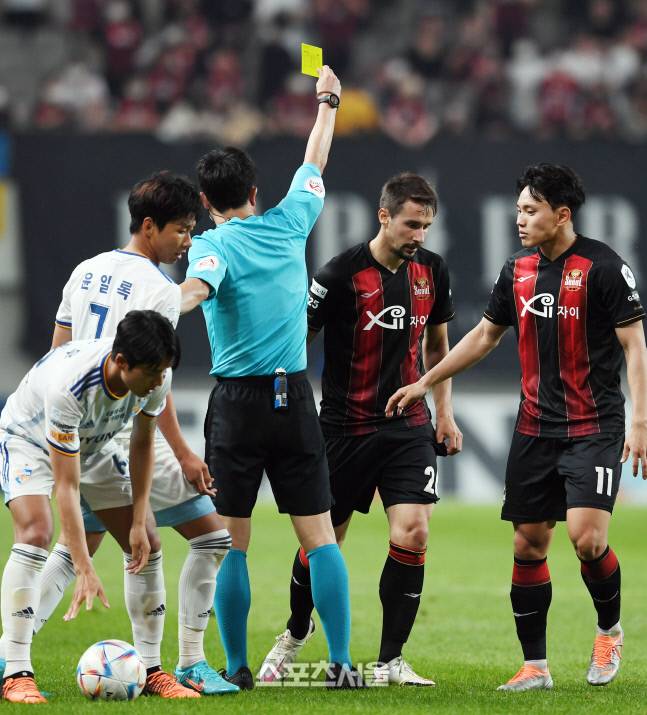 FC서울 팔로세비치(오른쪽 둘째)가 22일 서울월드컵경기장에서 열린 하나원큐 K리그1 2022 울산 현대와의 경기에서 울산 윤일록에게 백태클을 한 뒤 경고를 받고 있다. 2022. 6. 22.