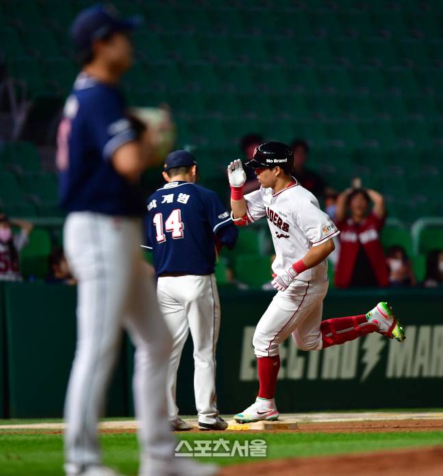 SSG 4번타자 한유섬이 22일 인천SSG랜더스필드에서 열린 2022프로야구 SSG랜더스와 두산베어스의 경기 7회말 1사 1루에서 3-3 균형을 깨는 우월2점홈런을 터트린 후 홈인하고 있다. . 2022.6.22.