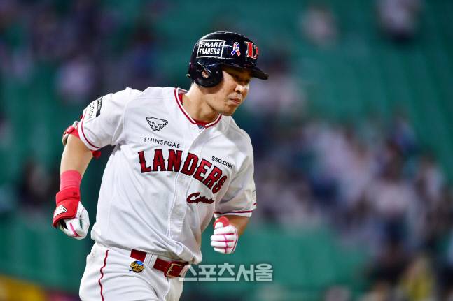 SSG 4번타자 한유섬이 22일 인천SSG랜더스필드에서 열린 2022프로야구 SSG랜더스와 두산베어스의 경기 7회말 1사 1루에서 3-3 균형을 깨는 우월2점홈런을 터트린 후 홈인하고 있다. . 2022.6.22.
