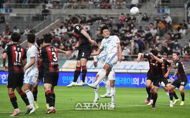 울산 현대 김기희(오른쪽)이 22일 서울월드컵경기장에서 열린 하나원큐 K리그1 2022 FC서울과의 경기에서 헤더슛을 하고 있다. 2022. 6. 22.