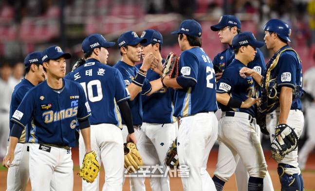 NC 선수들이 22일 수원 KT위즈파크에서 열린 KBO리그 KT와 경기 후 하이파이브를 하며 승리를 자축하고 있다.