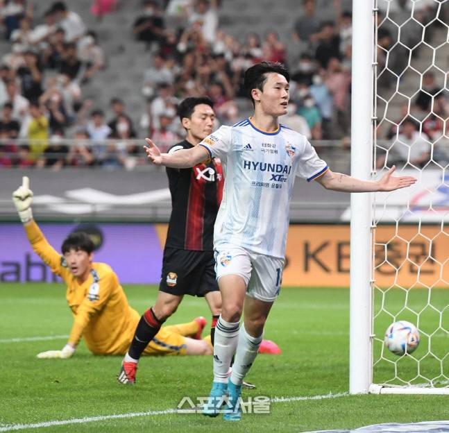울산 현대 엄원상이 22일 서울월드컵경기장에서 열린 하나원큐 K리그1 2022 FC서울과의 경기에서 역전골을 넣고 기뻐하고 있다. 2022. 6. 22.