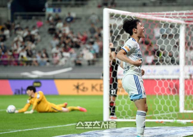 울산 현대 엄원상이 22일 서울월드컵경기장에서 열린 하나원큐 K리그1 2022 FC서울과의 경기에서 역전골을 넣고 기뻐하고 있다. 2022. 6. 22.