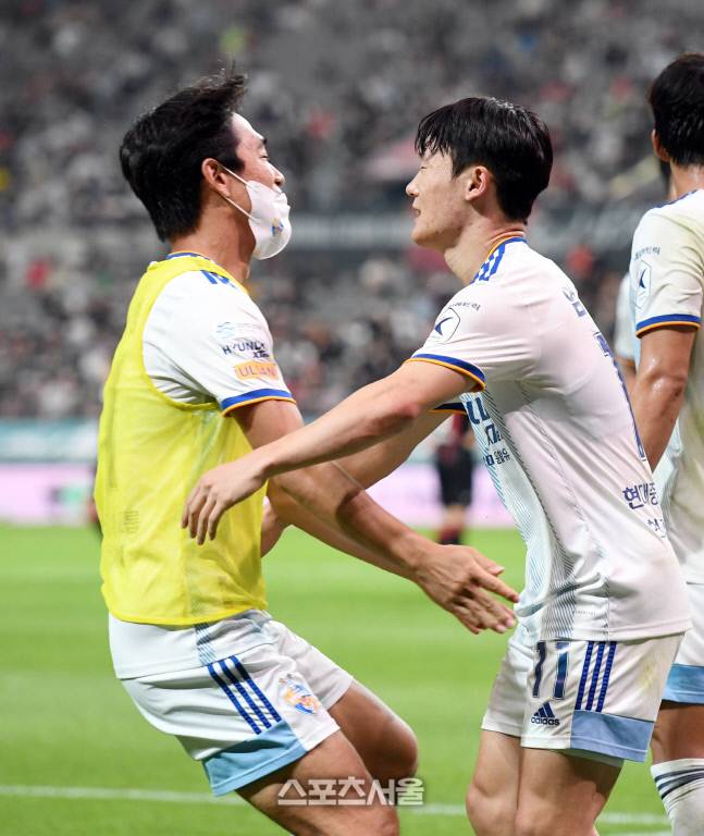 울산 현대 엄원상(오른쪽)이 22일 서울월드컵경기장에서 열린 하나원큐 K리그1 2022 FC서울과의 경기에서 역전골을 넣고 박주영과 함께 기뻐하고 있다. 2022. 6. 22.
