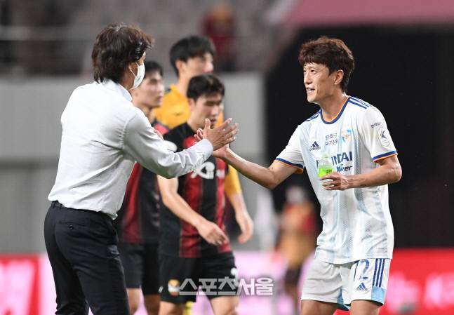 울산 현대 홍명보 감독(왼쪽)이 22일 서울월드컵경기장에서 열린 하나원큐 K리그1 2022 FC서울과의 경기에서 서울에 2-1 역전승을 한 뒤 이청용과 하이파이브를 나누고 있다. 2022. 6. 22.