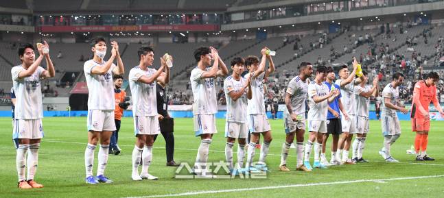 울산 현대 선수들이 22일 서울월드컵경기장에서 열린 하나원큐 K리그1 2022 FC서울과의 경기에서 2-1 역전승을 한 뒤 팬들에게 인사를 하고 있다. 2022. 6. 22.