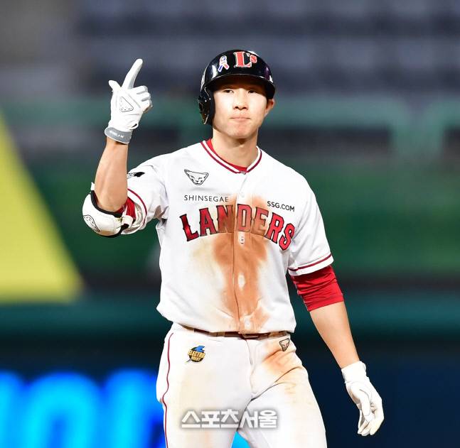 SSG 5번타자 박성한이 22일 인천SSG랜더스필드에서 열린 2022프로야구 SSG랜더스와 두산베어스의 경기 10회말 2루타로 출루하며 찬스를 만들고 있다. 2022.6.22.