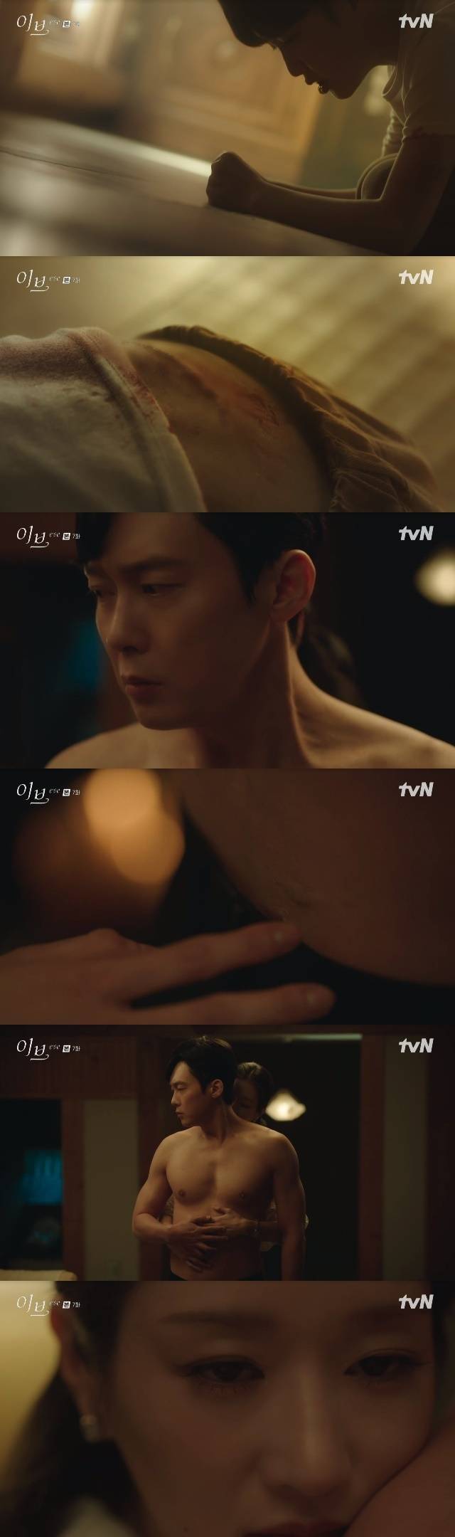 이어 학대 훙터가 있는 등에 입맞춤을 하며 애정을 드러냈다. 다만 뒤에서 강윤겸을 껴안은 이라엘의 눈빛은 냉정하게 빛나 눈길을 끌었다. 이후 두 사람은 각 집안에서 본인들을 찾는 상황에도 불구하고 며칠이나 외박을 했다. 그사이 한소라의 강박증세는 점점 심해졌다. (사진=tvN '이브' 캡처)