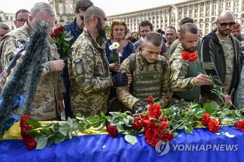 epa10027743 Relatives and friends attend the funeral ceremony of Ukrainian serviceman and politician Oleg Kytsyn at Maidan Nezalezhnosti Square in Kyiv (Kiev), Ukraine, 22 June 2022. Kytsyn, political activist and commander of the Karpatska Sich battalion of the Armed Forces of Ukraine, was killed in combat in the Kharkiv region on 19 June, amid the ongoing Russian invasion of Ukraine. EPA/OLEG PETRASYUK