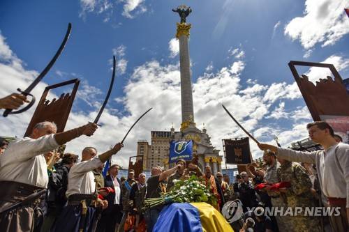 epa10027757 Relatives, friends and comrades attend the funeral ceremony of Ukrainian serviceman and politician Oleg Kytsyn at Maidan Nezalezhnosti Square in Kyiv (Kiev), Ukraine, 22 June 2022. Kytsyn, political activist and commander of the Karpatska Sich battalion of the Armed Forces of Ukraine, was killed in combat in the Kharkiv region on 19 June, amid the ongoing Russian invasion of Ukraine. EPA/OLEG PETRASYUK