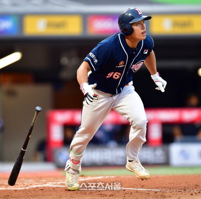 두산 8번타자 양찬열이 22일 인천SSG랜더스필드에서 열린 2022프로야구 SSG랜더스와 두산베어스의 경기 4회초 2사 1루에서 안타로 출루하고 있다.. 2022.6.22.