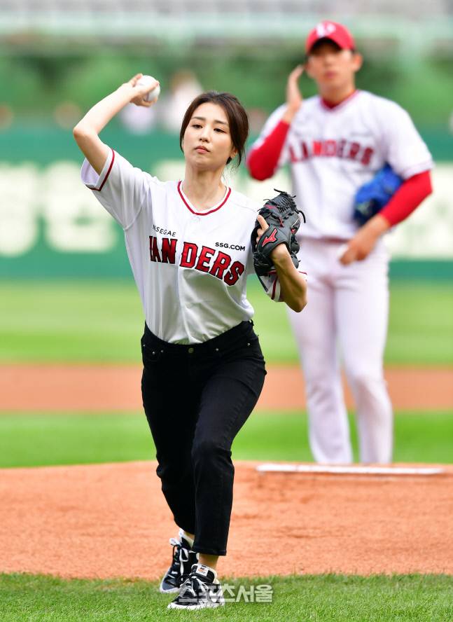 배우 박하선이 22일 인천SSG랜더스필드에서 열린 2022프로야구 SSG랜더스와 두산베어스의 경기에서 시구를 하고 있다. 2022.6.22.