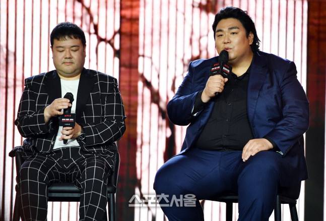 ‘헬싱키’역 김지훈과 ‘오슬로’역 이규호가 22일 코엑스 그랜드볼륨에서 열린 넷플릭스 시리즈 ‘종이의 집:공동경제구역(연출 김홍선, 극본 류용재)’ 제작발표회 무대에 올라 기자들의 질문에 답하고 있다.2022.6.22.