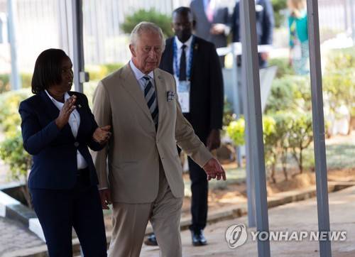 epa10028533 Britain's Prince Charles (C), the Prince of Wales during a visit to the Nyamata Church Genocide Memorial, outside Kigali, Rwanda, 22 June 2022. The Prince of Wales visits Rwanda to attend the Commonwealth Heads of Government Meeting (CHOGM). EPA/EUGENE UWIMANA