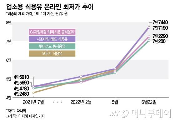 1년여 전인 지난해 7월 최저가와 비교하면 오뚜기 식용유 가격은 82%, 사조대림 해표 식용유는 69%, CJ제일제당 해피스푼 콩식용유와 롯데푸드 콩식용유는 57%씩 각각 뛰었다.