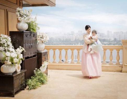 사진에는 곱게 한복을 차려입은 한지혜 모녀가 사진 촬영에 한창이다.