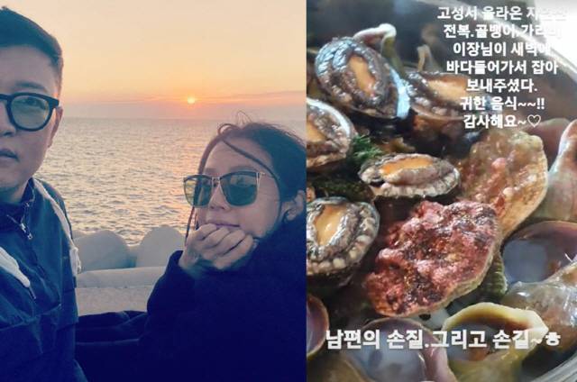 김지호는 22일 자신의 SNS를 통해 "고성서 올라온 자연산 전복, 골뱅이, 가리비. 이장님이 새벽에 바다 들어가서 잡아주셨다. 귀한 음식~~!! 감사해요~♡" "남편의 손질, 그리고 손길"라는 글과 함께 한 편의 영상을 게재했다.