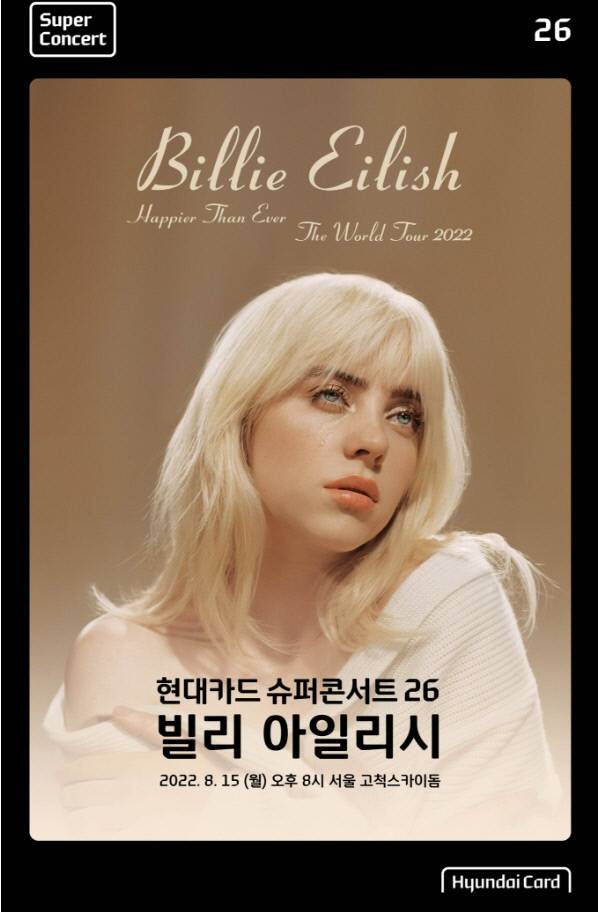 이번 ‘현대카드 슈퍼콘서트’는 지난 2020년 1월 ‘퀸(QUEEN)’ 공연 이후 약 2년 7개월 만에 올리는 무대다. 현대카드는 “음악을 사랑하는 많은 이들이 빌리 아일리시의 내한을 고대해 왔다며, 오랜 시간 슈퍼콘서트를 기다려 온 팬들의 기대를 만족시키기에 충분할 것”이라고 말했다.