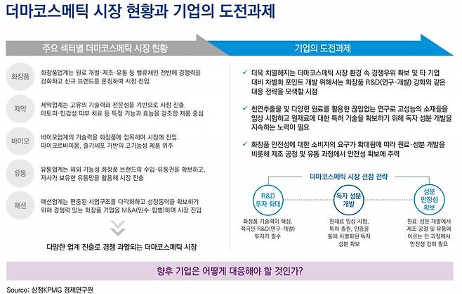 박관종 삼정KPMG 유통·소비재산업본부 상무는 “국내뿐만 아니라 해외에서도 기능성 성분 중심의 더마코스메틱에 대한 관심이 높아지고 있어 중국·일본·홍콩·북미 등으로의 진출 기회를 모색해 볼 수 있다”고 밝혔다.