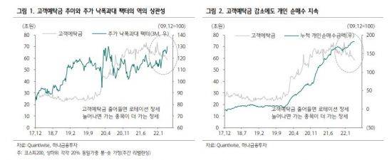 통상 예탁금 감소는 증시 부진으로 개인들이 주식시장을 떠났을 경우도 있지만, 낮은 가격에 저점매수하면서 예탁금을 소진할 가능성도 있다. 실제 이달 들어 지난 21일까지 개인은 국내 주식시장에서 4조7217억원 순매수했는데. 이 기간 예탁금은 이달 21일 61조6321억원에서 4조6700원 가량 줄며 비슷한 규모를 보였다.