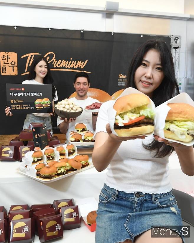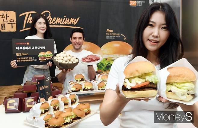 버거 프랜차이즈 롯데리아가 23일 오전 서울 마포구 롯데리아 홍대점에서 불고기버거 출시 30주년 기념해 출시한 신제품 '더블 한우불고기 버거와 한우 트러플머쉬룸 버거'를 선보이고 있다.