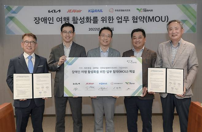 한화호텔앤드리조트에 따르면 지난 22일 기아, 제주항공, 한국철도공사(코레일), 사단법인 그린라이트와 장애인 여행 활성화를 위한 업무협약(MOU)을 체결했다.